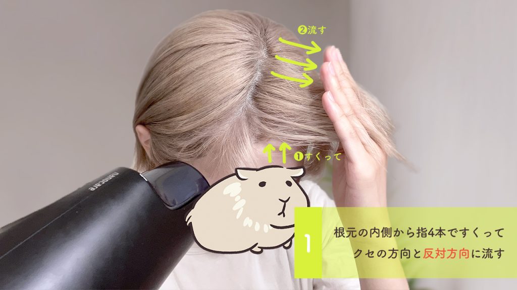 前髪は根元の内側から指4本ですくってクセの方向と反対方向に軽く引っ張るようにして流します。