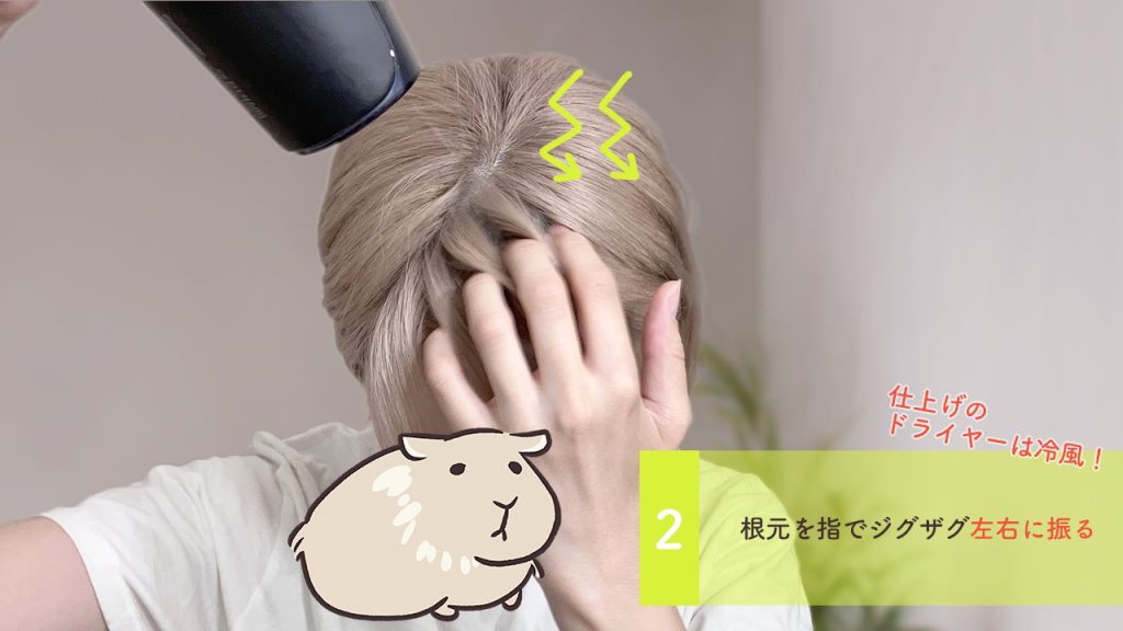 9割乾いたら顔を元に戻して、再びキューティクルが整うようにドライヤーを上から当てて指で左右に振ります。指を通して湿ってる所は温風で、乾いてきたら冷風に切り替えて仕上げます。