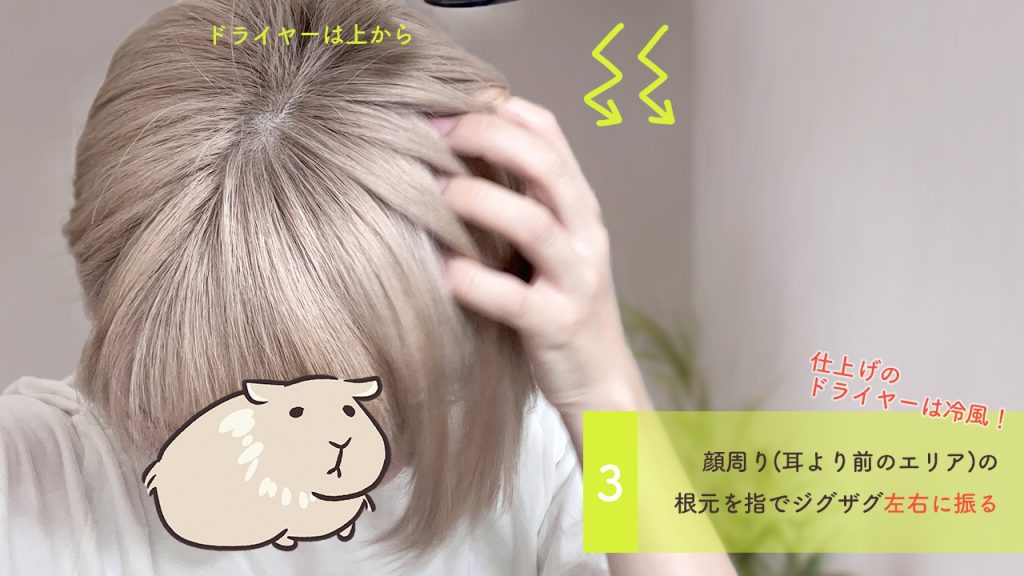 次は耳より前の顔周り(左右)を乾かします。ドライヤーは上から当てて指で左右に振ります。上から当てることでキューティクルが整います。