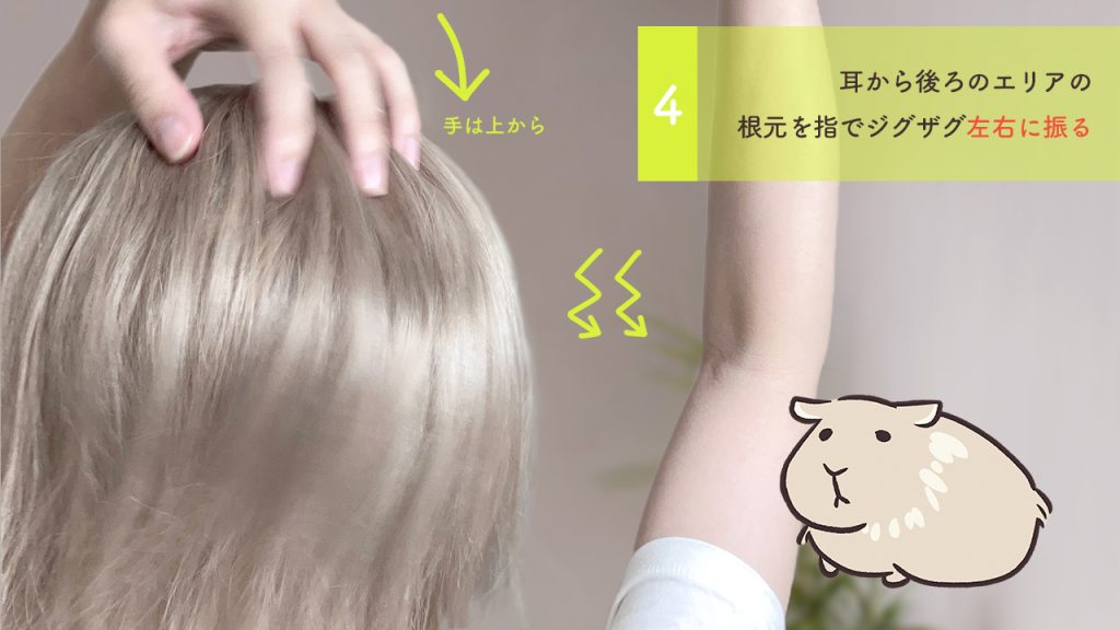 - 後頭部:耳から後ろのエリアの根元を指でジグザグ左右に振る