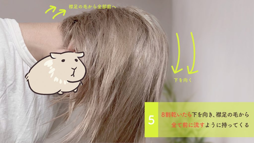 - 後頭部:8割乾いたら下を向き、襟足の毛から全て前に流すように持ってくる