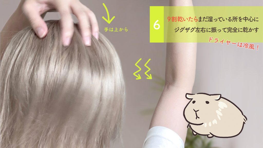 前途しましたが早く水気がなくなるブロックからドライヤーします。自然乾燥で乾いてしまうとそのまま変なクセがつくので早めにドライヤーを使うのがポイントです。順番は以下です。