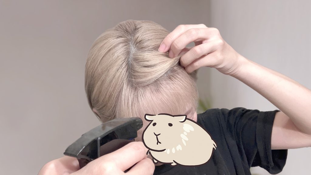 ブロッキングした内側から、真ん中→右サイド→左サイドの順に毛束を取って根元にスプレーします。