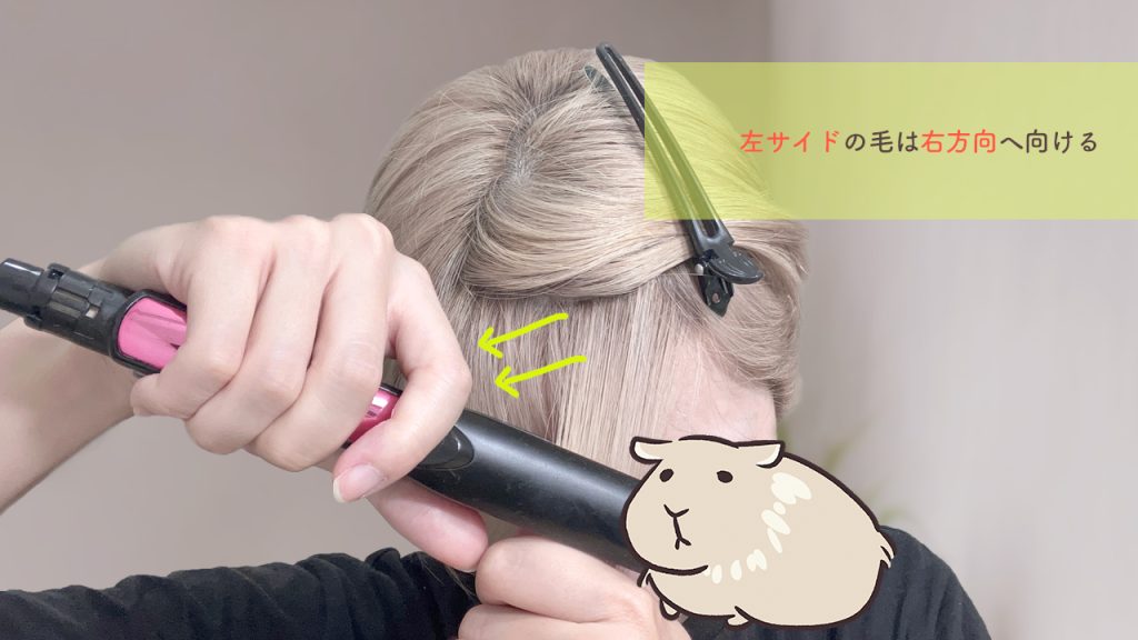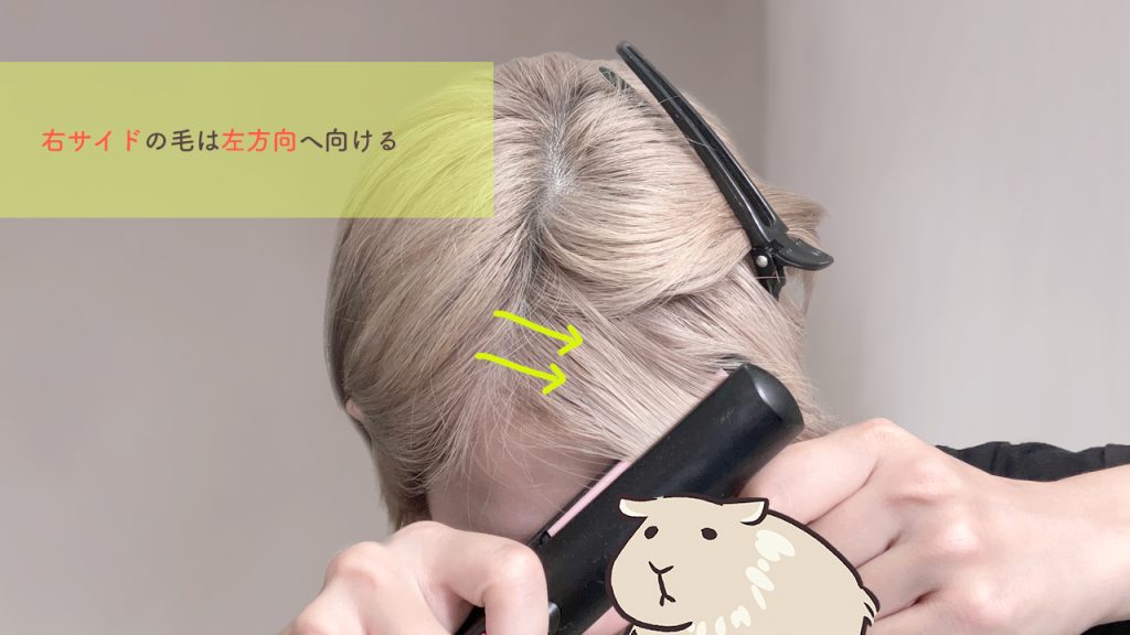 2:右サイドの毛束を取って左方向に向けてアイロンを通します。