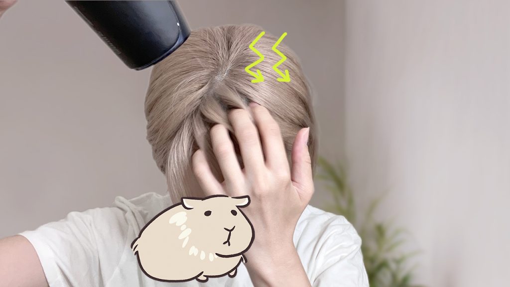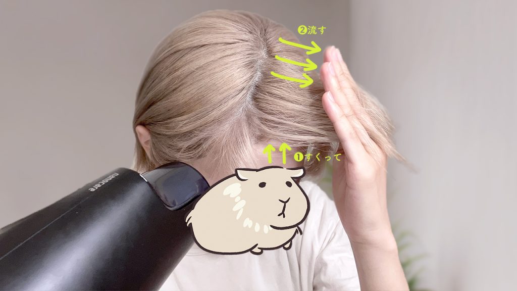 表面はドライヤーは上から当てて、根元を指でジグザグ左右に振ります。