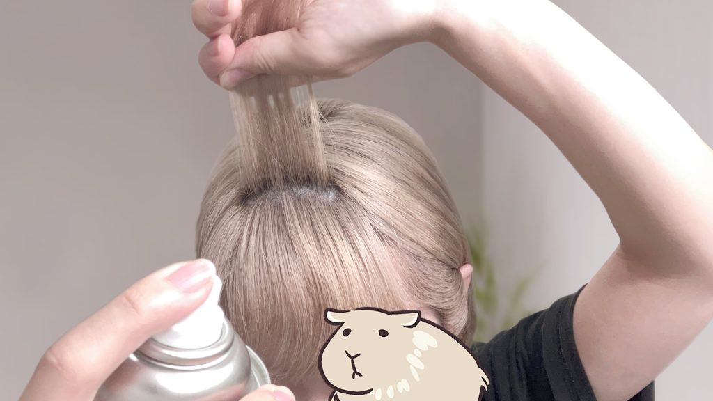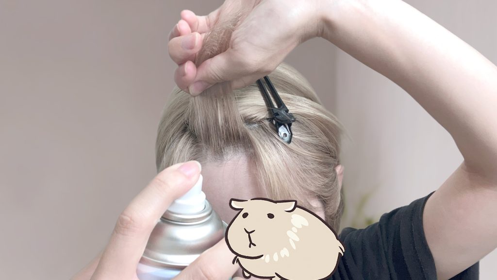 次はブロッキングした表面を、同じように真ん中→右サイド→左サイドの順に毛束を取って根元にスプレーします。